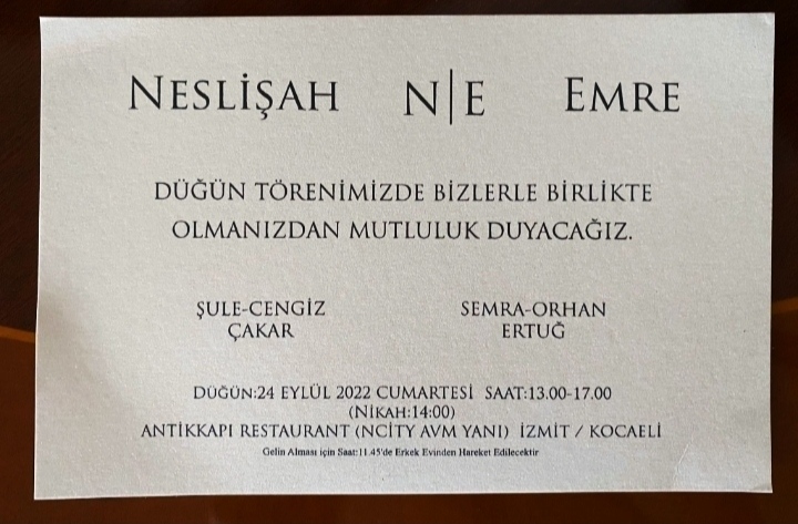Neslişah ile Emre’nin düğünleri 24 Eylül 2022 Cumartesi (yarın) saat 13:00-17:00 arasında Antikkapı restaurantta gerçekleştirilecek. Genç çiftin nikahı saat 14:00 de olacak.