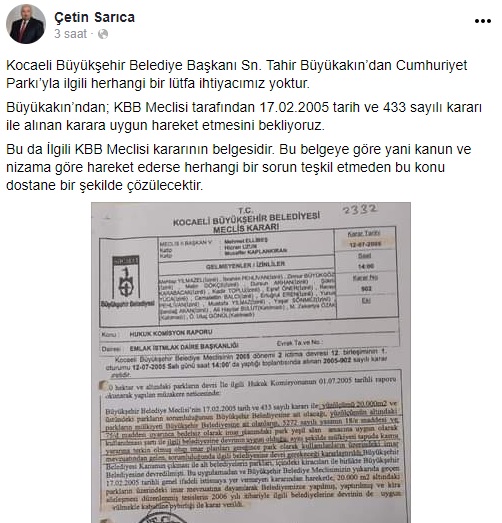 2005 yılında Kocaeli Büyükşehir Belediye meclisinde alınan kararı da yayınlayan Sarıca, “Kocaeli Büyükşehir Belediye Başkanı Sayın Tahir Büyükakın’dan Cumhuriyet Parkı’yla ilgili herhangi bir lütfa ihtiyacımız yoktur. Büyükakın’dan; Kocaeli Büyükşehir Belediye Meclisi tarafından 17.02.2005 tarih ve 433 sayılı karar ile alınan karara uygun hareket etmesini bekliyoruz. Bu da ilgili KBB Meclis kararının belgesidir. Bu belgeye göre yani kanun ve nizama göre hareket ederse herhangi bir sorun teşkil etmeden bu konu dostane bir şekilde çözülecektir” ifadelerini kullandı.