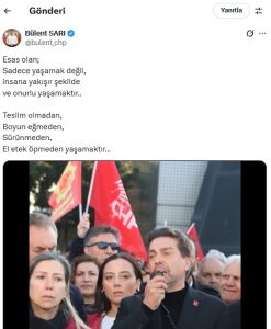 Cumhuriyet Halk Partisi İl Başkanı Bülent Sarı bugün yayınladığı sosyal medya paylaşımında emek mücadelesine vurgu yaptı. Göreve geldiği ilk günden bu yana grev çadırlarına koşan, emek mücadelesine büyük önem ve destek veren Bülent Sarı dayanışma çağrısında bulundu.