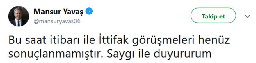 CHP ve İYİ Parti ittifakı ile aday olması beklenen Mansur Yavaş, sosyal medya hesabından açıklama yaparak, bu saat itibariyle ittifak görüşmeleri henüz sonuçlanmamıştır ifadelerini kullandı.