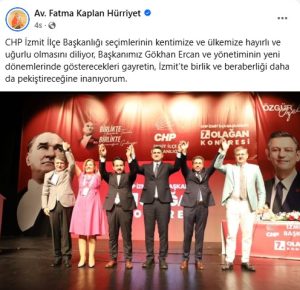 CHP İzmit İlçe kongresi gerçekleştirildi, seçime tek aday olarak giren Gökhan Ercan yeniden başkan seçildi. İzmit Belediye Başkanı Fatma Kaplan Hürriyet kongre sonrası mesaj yayınladı.