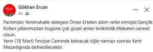 CHP İzmit İlçe Başkanı Gökhan Ercan, yaptığı paylaşımda, ‘Partimizin Yenimahalle delegesi Ömer Ertekin abim vefat etmiştir. Gençlik Kolları yıllarımızdan bugüne çok güzel anılar biriktirdik. Mekanın cennet olsun’ İfadelerine yer verdi.
