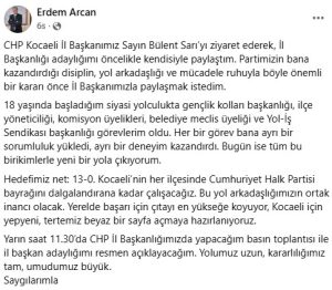 Kulislerde bir süredir konuşulan isim İzmit Belediye Başkan Yardımcısı ve Meclis üyesi Erdem Arcan il başkanlığına adaylığını duyurdu. Erdem Arcan, Başkan Hürriyet’in en yakın çalışma ekibinden biriydi.