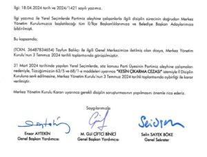 CHP Genel Merkez Yönetimi, 31 Mart seçiminde CHP Körfez Belediye Başkan Adayı Tayfun Balıkçı hakkında kesin ihraç istemiyle disiplin kuruluna sevk etti. Seçim bölgesi olan Dilovası yerine aday gösterilmeyi beklediği ancak yapılmadığı Darıca’da parti aleyhine çalıştığı gerekçesiyle Dilovası Belediye Başkan adayı olan Yakup Törk hakkında ise 1 yıl boyunca partiden uzaklaştırma kararı verildi.