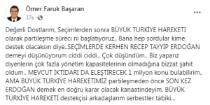 Başaran yaptığı paylaşımda şu ifadelere yer verdi: “Değerli Dostlarım, Seçimlerden sonra Büyük Türkiye Hareketi olarak partileşme sürecini başlatıyoruz. Bana hep sordular kime destek olacaksın diye. Seçimlerde kerhen Recep Tayyip Erdoğan demeyi düşünüyorum ciddi ciddi. Çok düşündüm. Biz yaparız diyenlerin çok fazla yönetim kapasitelerinin olmadığına bizzat şahit oldum. Mevcut iktidarı da eleştirecek 1 milyon konu bulabilirim. Ama Büyük Türkiye Hareketimiz partileşmeden önce son kez Erdoğan demek en doğru karar olacak kanaatindeyim. Büyük Türkiye Hareketi destekçisi arkadaşlarım serbestler tabiki…”