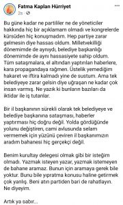 İzmit Belediye Başkanı Fatma Kaplan Hürriyet bugün gerçekleşen kongrenin ardından sosyal medya hesabından tepkisini gösterdi. İsmi delege listesinde yer almayan Fatma Kaplan Hürriyet, şu paylaşımda bulundu: