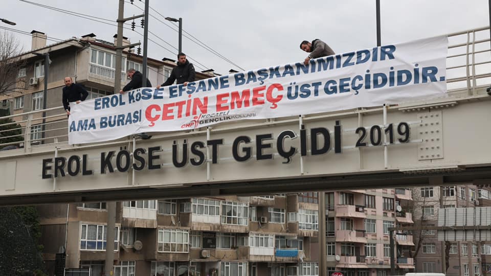 CHP Kocaeli Gençlik Örgütleri İl Başkanı Emre Andız ve yönetim kurulu üyeleri Kocaeli Büyükşehir Belediyesi tarafından yenilenen ve ismi Erol Köse olarak değiştirilen eski Çetin Emeç Köprüsü’nün üstüne çıkarak ilginç bir eyleme imza attılar. “Erol Köse Efsane Başkanımızdır ama burası Çetin Emeç üst geçididir” yazılı pankartı köprünün üzerine astı.