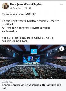 Şeker çiftinin evde tedavileri devam ederken, CHP Genel Başkan Yardımcısı Onursal Adıgüzel sosyal medya hesabından kongreye katıldıkları için bir çok AK Partili siyasetçinin isimlerini yazarak, koronaya yakalandıklarını iddia etti. Algı yaratmak için de Fahrettin Koca’ya seslendi. İşte o paylaşımı sormadan soruşturmadan yine birçok bazı gazete ve internet sitesi de aynı amaçla haber yaptı. Evinde tedavisi devam eden ve dinlenmekte olan AK Parti Kocaeli Milletvekili İlyas Şeker’i bu paylaşımları ve çıkan haberleri görünce hep Adıgüzel’e hem de haberi yapan gazetelere sosyal medya hesabından tepki gösterdi. Şeker yapmış olduğu ilk paylaşımda “Ayıptır, bu kadar yalanı nasılda yüzünüz kızarmadan söyleyebiliyorsunuz. Eşimin Covid testi 20 Mart’ta, benimki 22 Mart’ta pozitif çıktı. AK Partimizin Kongresi 24 Mart’ta yapıldı. Katılamadım. Bari özür dileyin de özür dilemek erdemliktir. Vasfından faydalanın! İkinci paylaşımında yine bu paylaşımı haber yapan bir başka gazetenin haber ile paylaşan Şeker, ” Yalanı yayanda Yalancıdır. Eşimin Covid testi 20 Mart’ta, benimki 22 Mart’ta pozitif çıktı. AK Partimizin kongresi 24 Mart’ta yapıldı. Katılmadım. Yalancılar çoğalınca mumlar yatsı olmadan sönüyor! İfadelerini kullandı.