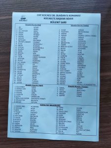 CHP İzmit Ilçe’nin yazdığı kurultay delege adayları ve yönetim kurulu üyesi adayları, daha önce destek açıklaması yaptıkları Bülent Sarı’ya tepki olarak listeden çıktı. Sebep olarak İzmit İlçe’nin yönetim ve kurultay taleplerinin yerine gelmemesi gösterildi.