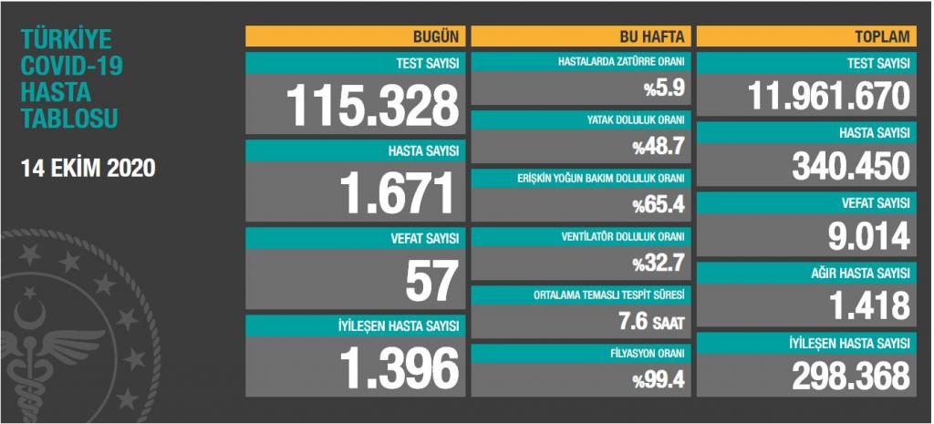 Sağlık Bakanı Fahrettin Koca, 14 Ekim tarihine ait Türkiye’deki korona virüs hasta ve vefat sayısını açıkladı. Bakan Koca’nın açıkladığı veriye göre Türkiye’de bugün bin 671 yeni hasta tespit edildi, 57 kişi ise hayatını kaybetti.