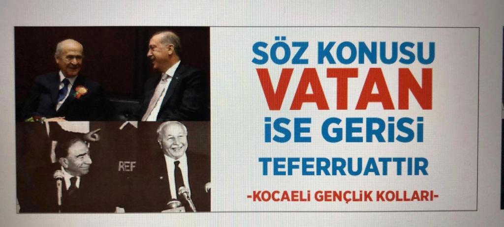 ‘Kocaeli burada Reis’inin yanında’ sloganı atarak ‘Söz konusu vatan ise gerisi teferruattır’ pankartı açan AK Genç Kocaeli ekibi, Cumhurbaşkanı Erdoğan’dan yine tam not aldı. Açtıkları 360 metrekarelik dev pankartı gören Cumhurbaşkanı Erdoğan, “Söz konusu vatan ise gerisi teferruattır. İşte; Cumhur ittifakının tanımı budur. Pazara kadar değil inşallah mezara kadar. Milletin değerlerine sahip çıkmayanların, şehircilik mirasına sahip çıkması, zaten işin tabiatına aykırı. Mazisiyle barışık olmayan geleceğini inşa edemez” ifadelerine yer verdi.