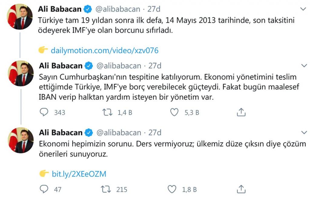 Cumhurbaşkanı Erdoğan’ın “IMF bizden 5 milyar dolar istedi. O zamanki bakan ‘bu borcu verelim mi?’ dedi. ‘Verelim’ dedim. Bugün borcu alan yarın talimat alır. Şimdi parti kurmuş bize ekonomi dersi veriyor” sözlerine Babacan, “Sayın Cumhurbaşkanı’nın tespitine katılıyorum. Ekonomi yönetimini teslim ettiğimde Türkiye, IMF’ye borç verebilecek güçteydi. Fakat bugün maalesef IBAN verip halktan yardım isteyen bir yönetim var” yanıtını verdi.