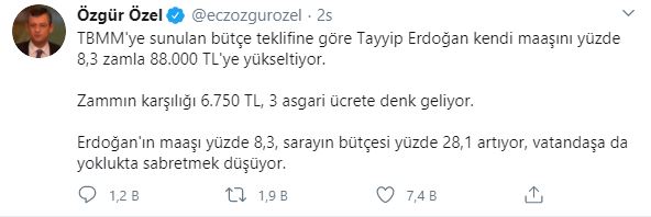 ‘TBMM’ye sunulan bütçe teklifine göre Tayyip Erdoğan kendi maaşını yüzde 8,3 zamla 88.000 TL’ye yükseltiyor. Zammın karşılığı 6.750 TL, 3 asgari ücrete denk geliyor. Erdoğan’ın maaşı yüzde 8,3, sarayın bütçesi yüzde 28,1 artıyor, vatandaşa da yoklukta sabretmek düşüyor.’