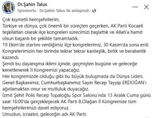 Ak Parti Kocaeli İl Kongresi’ne Cumhurbaşkanı Recep Tayyip Erdoğan geliyor. İl Başkanı Şahin Talus, Kocaelililer’i il kongresine davet etti.
