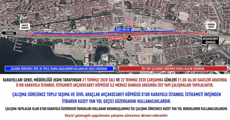 Karayolları Genel Müdürlüğü tarafından 21 Temmuz ve 22 Temmuz günleri saat 21.00-06.00 arasında yapılacak çalışmalar nedeniyle d-100 Karayolu İstanbul istikameti trafiğe kapatılacak. Çalışma süresince toplu taşıma araçları ve sivil araçlar Akçakocabey Köprüsü D-100 Karayolu İstanbul istikameti inişinden itibaren kuzey yan yol geçici güzergahını kullanacaklar.