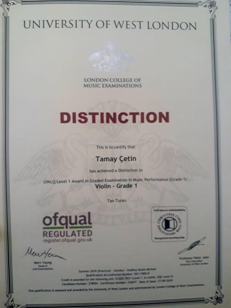 Özel Seymen Darıca Ortaokul öğrencisi Tamay Çetin tüm dünyada geçerli enstrüman sertifikasyon programlarından olan ve İngiltere’den gelen komisyon tarafından yapılan LCM ( London College of Music) sınavı sonucunda, Keman dalında Grade 1 sertifikasını başarıyla aldı.