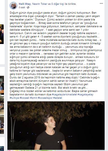 O paylaşımda şu ifadeleri kullandı. ‘Doğum günün diye çocuğun pasta alıyor, doğum gününü kutluyorsun. Ben arkadaşlarımla dışarı çıkacağım diyor. “Tamam o zaman pastayı yarın akşam hep beraber yiyelim.” Diyorsun. Çünkü evladın yokken bir dilim pasta bile geçmiyor boğazından … Birkaç saat sonra telefonun çalıyor ve “çocuğunuz hastanede” diyorlar. Koşa koşa gidiyorsun, bekliyorsun, saniyeler dakikalara ve dakikalar saatlere dönüşüyor . 1 saat geçiyor ama sanki sen 1 yıldır bekliyorsun. Canını ver evladını yaşatalım deseler bıçağı kalbine saplarsın … sana 4 – 5 yıl gibi gelen 4 – 5 saatten sonra diyorlar ki çocuğunuzu kaybettik… çok kan kaybetti çünkü… hatta müdahale esnasında kalbi durdu birkaç kez… o an görünen şey o masum çocuğun kalbinin durduğu ancak kimsenin bilmediği ise anne babasının da o an kalbinin durduğu … yavrumuzu alıp toprağa veriyoruz yuvası ise çoktan ailesine mezar olmuş … bilmiyoruz biz göremiyoruz onlar o mezarın içerisinde … cenazesi için getirilen sular, ayranlar dolaba sığmıyor çünkü annesine aldığı pasta dolapta duruyor… annesi kokusunu bir daha hiç duyamayacağı evladının yastığıyla avunmaya çalışıyor . Naaşını yatağına koyalım diye yalvarıyor ve biz hiçbir şey yapamıyoruz … o pasta çocuğunun aldığı son hediye olarak kalacak ve her geçen yıl o doğum günü kalbine bir hançer gibi saplanacak… başka bir ananın babanın yetiştirdiği evlat gelip bizim yavrumuzu öldürecek ve yavrumuz gibi hepimizin kalbi duracak… Durdu da! 2 Ağustos 2019 da hepimizin kalbine ateş düştü ! Cebinde bıçağını eksik etmeyince kendini dünyanın sahibi sanan bir insan(!) Yavrumuza sapladığını sandığı bıçağını hepimize sapladı! Bizim yavrumuz geri gelmeyecek! Sadece 21 yıl bizimle kaldı. Bizi eksik bıraktı ve gitti… Çağatay’ımızı bizden aldılar ve kalbimizi soldurdular. Başka canlar gitmesin başkalarının da kalbi durmasın diye #cagataylaricinadalet  #cagatayatay #turkiye  #kocaeli  #izmit  #kocaelispor #adalet