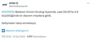 AFAD, depremin şiddetini 4,9 olarak duyurdu.