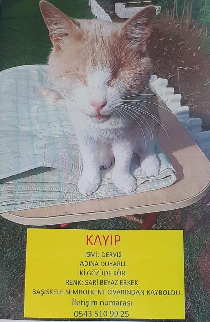 Başiskele İlçesi, Döngel merkez mahallesinde ikamet eden Ömer Ayhan’ın doğuştan görme engeli olan  ‘Derviş ‘ isimli kedisi kayboldu.  Sahibine duyarlı olan sarı beyaz renkteki kedisinden bir süredir haber alamayan Ayhan,  kedisini gören yada bulanların 0 543 510 99 25 numaralı telefondan bilgi vermesini bekliyor.