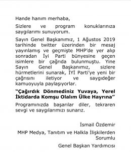 Hande Fırat MHP Genel Başkan Yardımcısı İsmail Özdemir’in mesajını şu sözlerle aktardı. ‘Sayın Genel Başkanımız, 1 Ağustos 2019 tarihinde twitter üzerinden bir mesaj yayınlamış ve geçmişte MHP’de yer alıp daha sonra İYİ Parti bünyesine geçem isimlere bir çağırda bulunmuştu. Yine sayın Genel başkanımız sizlere hürmetlerini sunarak İYİ Parti’ye yeni bir çağrını iletiyor ve saygıdeğer kamuoyuyla paylaşıyorlar: