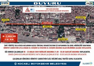 Kocaeli Büyükşehir Belediyesi iştiraklerinden İSU Genel Müdürlüğü, İzmit ilçesinde yürüyüş yolu atık su hatlarının kazısız yöntemle rehabilitasyonu işi kapsamında Leyla Atakan Caddesi’nin İstasyon Caddesi kesişimi arasında yer alan Hürriyet Caddesi’nde çalışma yapacak. Çalışma süresince araç geçişine izin verilmeyen güzergahlar için Ulaşım Dairesi Başkanlığınca geçici güzergahlar belirlendi.