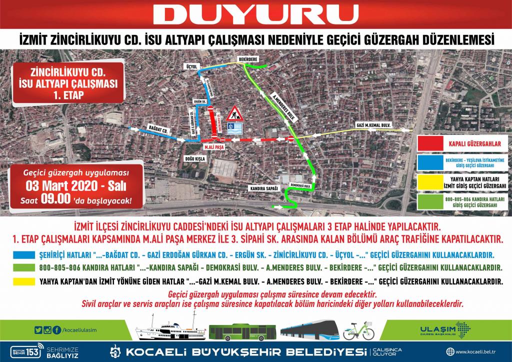 Kocaeli Büyükşehir Belediyesi iştiraklerinden İSU, 3 Mart Salı (yarın) günü itibariyle İzmit İlçesi Zincirlikuyu Caddesi’nde altyapı çalışması yapmaya başlayacak. Toplu taşıma araçlarının kullandığı güzergâh üzerinde yapılacak çalışma için Kocaeli Büyükşehir Belediyesi Ulaşım Dairesi Başkanlığı tarafından geçici güzergâh oluşturuldu.