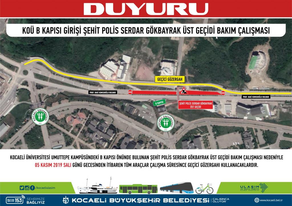 Kocaeli Büyükşehir Belediyesi’nce 2016 yılında Kocaeli Üniversitesi Umuttepe yerleşkesinde öğrencilerin karşıdan karşıya güvenli geçişlerini sağlamak için yaya köprüsü inşa etmişti. Geçtiğimiz ay yaşanan kaza nedeniyle yaya trafiğine kapatılan Şehit Polis Serdar Gökbayrak üst geçidinde çalışma yapılacak. 5 Kasım Salı gecesi itibariyle başlayacak çalışma boyunca Prof. Baki Komsuoğlu Bulvarı trafiğe kapatılacak. Yapılacak bakım çalışmaları nedeniyle özel ve toplu taşıma araçları için geçici güzergâh oluşturuldu.