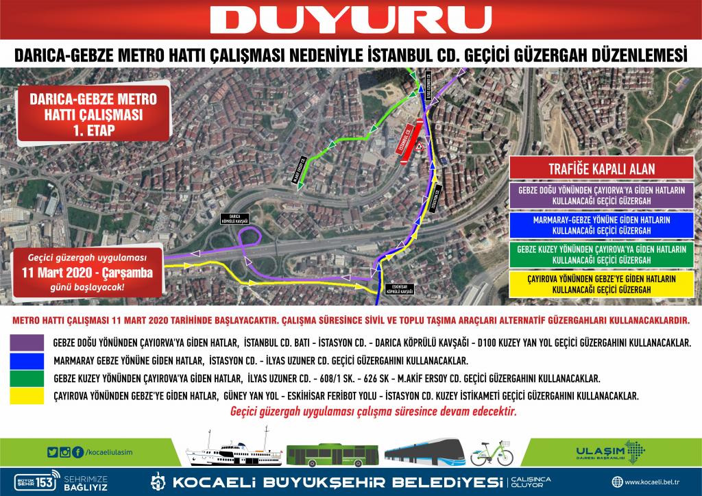 Darıca – Gebze Metro hattı çalışması nedeniyle İstanbul Caddesi kapatılıyor. 11 Mart 2020 Çarşamba günü itibariyle başlayacak çalışma kapsamında yol araç trafiğine kapatılacak. Güzergahı kullanan toplu taşıma ve özel araçlar için geçici güzergah uygulaması yapıldı. Gebze doğu yönünden Çayırova’ya giden hatlar İstanbul Caddesi batı, İstasyon Caddesi, Darıca Köprülü Kavşağı ve D100 Kuzey Yan Yol geçici güzergahını kullanacak.