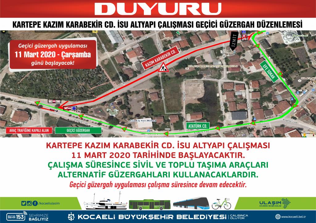 Kartepe ilçesi Kazım Karabekir Caddesi ise İSU altyapı çalışması nedeniyle araç trafiğine kapatılacak. 11 Mart 2020 Çarşamba günü itibariyle başlayacak çalışma kapsamında geçici güzergah oluşturuldu. Kazım Karabekir Caddesi’ni kullanan araçlar geçici güzergah uygulaması kapsamında Efe Sokak ve Atatürk Caddesi’ni kullanacak.