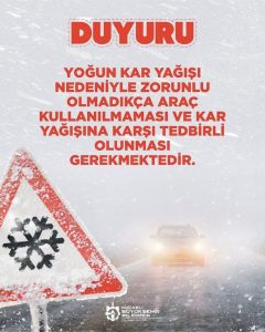 Kocaeli Büyükşehir Belediyesi sosyal medyadan yaptığı paylaşımda zorunlu olmadıkça trafiğe çıkmayın uyarısında bulundu. Büyükşehir belediyesinin yaptığı paylaşımda, ” Kar yağışı bugün de kent genelinde etkisini yoğun bir şekilde gösterecektir. Olası kazaların önüne geçebilmek için lütfen zorunlu olmadıkça trafiğe çıkmayınız” ifadelerine yer verildi.