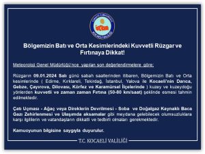 Rüzgarın 09.01.2024 Salı günü sabah saatlerinden itibaren, Bölgemizin Batı ve Orta kesimlerinde ( Edirne, Kırklareli, Tekirdağ, İstanbul, Yalova ile Kocaeli’nin Darıca, Gebze, Çayırova, Dilovası, Körfez ve Karamürsel İlçelerinde ) kuzey ve kuzeydoğu yönlerden kuvvetli ve zaman zaman Fırtına (50-80 km/saat) şeklinde esmesi tahmin edilmektedir.