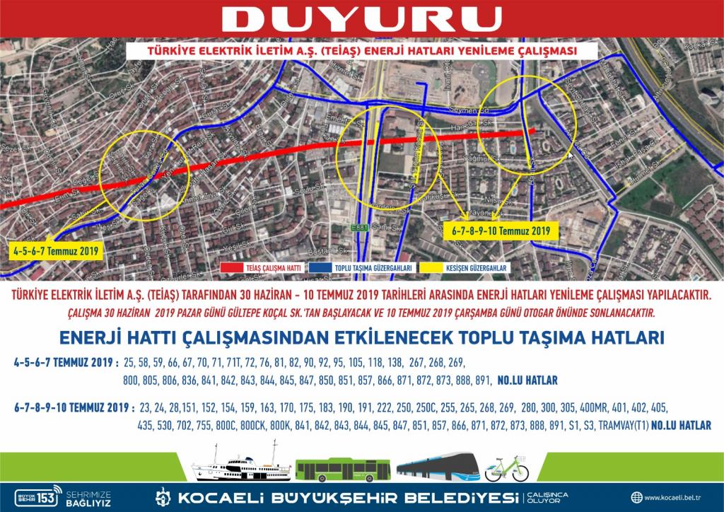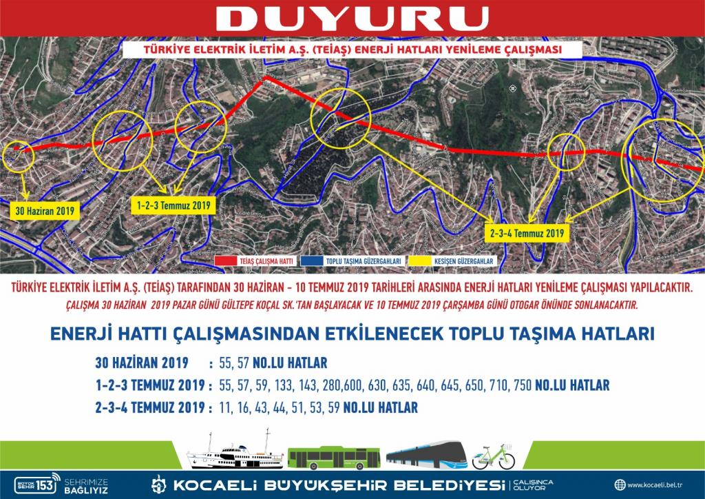 Türkiye Elektrik İletim A.Ş. 30 Haziran – 08 Temmuz 2019 Tarihleri arasında enerji hatları yenileme çalışması yapacak. Ana arterler üzerinde yapılacak çalışmalar sırasında sefer yapan otobüsler Kocaeli Büyükşehir Belediyesi Ulaşım ve Trafik Yönetimi Dairesi Başkanlığı’na bağlı ekipler tarafından yönlendirilecek.