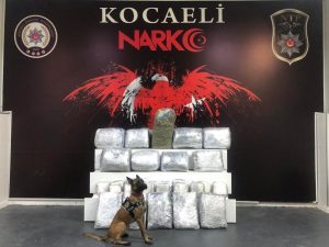 Kocaeli İl Emniyet Müdürlüğüne bağlı Narkotik Suçlarla Mücadele Şubesine bağlı ekipler tarafından, alınan duyum ve yapılan istihbari çalışmalar sonucunda takibe alınan bir araç, Dilovası İlçesi Osmangazi Köprüsü çıkışında durduruldu. Araçta dedektör Köpeği Nitro ile yapılan aramada, narkotik köpeğinin tepki vermesi üzerine, içerisinde yüklü bulunan koliler kontrol edildi. Yapılan kontrollerde 27 paket halinde 106 kilo 700 gram Skunk ismi verilen uyuşturucu madde ele geçirildi. Olayla ilgili gözaltına alınan 3 kişi, tamamlanan işlemlerinin ardından Pazar günü öğle saatlerinde adli merciilere sevk edildi.