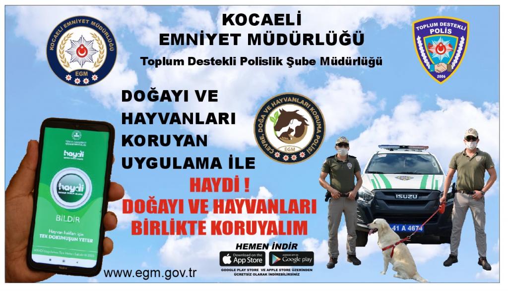 Kocaeli’nde de, suçla mücadelede toplumun katılım ve desteği amaçlanan Toplum Destekli Polislik Şube Müdürlüğü tarafından gerçekleştirilen çalışmalar kapsamında, hazırlanan görsel kamu spotları tramvay ve benzeri toplu ulaşım araçlarının ve alışveriş merkezlerinin elektronik ekranlarında, otobüs arkalarında ve Kocaeli genelinde billboardlarda yayınlandı. Ayrıca sesli kamu spotları da yerel radyolarda belirli aralıklar ile proje ile ilgili bilgiler vererek vatandaşı bilinçlendiriyor. Hayvan, çevre ve doğaya karşı işlenen suçları tek tuşla, görüntülü veya yazılı bir şekilde anlık olarak Acil Çağrı Merkezine bildirilmesi amacıyla hazırlanan proje kapsamındaki ‘HAYDİ’ uygulamasının kısa sürede herkes tarafından akıllı cep telefonlarına indirilerek kullanılması bekleniyor.