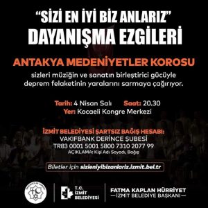İzmit Belediyesi öncülüğünde 4 Nisan’da depremzedeler için organize edilen ‘Sizi En İyi Biz Anlarız Dayanışma Ezgileri’ konserinde, Hatay Antakya Medeniyetler Korosu sahne alacak