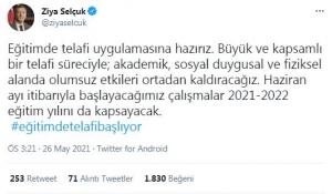 Selçuk, sosyal medya hesabından “eğitimdetelafibaşlıyor” etiketiyle yaptığı paylaşımda,”Eğitimde telafi uygulamasına hazırız. Büyük ve kapsamlı bir telafi süreciyle akademik, sosyal duygusal ve fiziksel alanda olumsuz etkileri ortadan kaldıracağız. Haziran ayı itibarıyla başlayacağımız çalışmalar 2021-2022 eğitim yılını da kapsayacak.” ifadelerini kullandı.