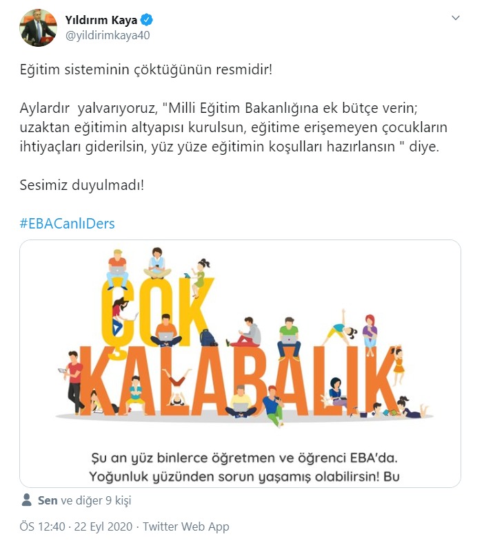 Aylardır yalvarıyoruz, “Milli Eğitim Bakanlığına ek bütçe verin; uzaktan eğitimin altyapısı kurulsun, eğitime erişemeyen çocukların ihtiyaçları giderilsin, yüz yüze eğitimin koşulları hazırlansın ” diye. Sesimiz duyulmadı! #EBACanlıDers