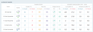 Kocaelililer hafta sonuna kar yağışıyla girebilir. Hava sıcaklığı 13 Ocak Cumartesi gününe kadar kademeli olarak düşecek. Çarşamba günü 6 derece, perşembe günü 4 derece, cuma günü 2 derece ve en sonunda cumartesi günü -2 derece olacak.