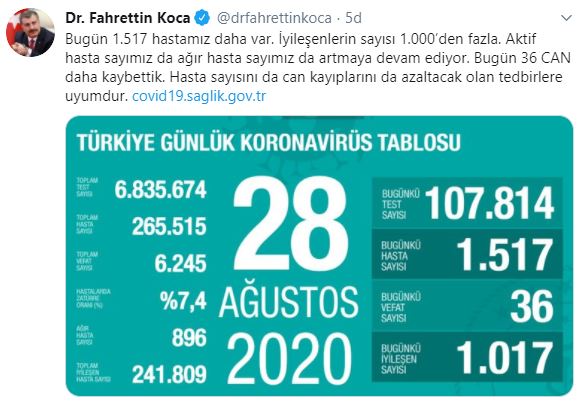 Sağlık Bakanı Fahrettin Koca, 28 Ağustos tarihine ait Türkiye’deki korona virüs hasta ve vefat sayısını açıkladı. Bakan Koca’nın açıkladığı veriye göre Türkiye’de bugün bin 517 yeni hasta tespit edildi, 36 kişi ise hayatını kaybetti.