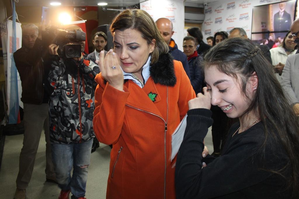 Hürriyet’in konuşmasının ardından ilk kez oy kullanacak ve doğuştan engelli olan Begüm Çakır kürsüye geldi. Çakır, “Ben doğuştan engelli bir bireyim. Bizler kendimizi topluma kabul ettirmeye çalışıyoruz. Sayın belediye başkan adayımız Fatma Kaplan Hürriyet’ten seçildiği zaman bizlere destek olmasını bekliyoruz. Ben 18 yaşına yeni girdim ve ilk oyumu Hürriyet’e vereceğim” dedi. Sahnede yazdığı mektubu da okuyan Çakır ile Hürriyet arasında oldukça duygusal anlar yaşandı. Hürriyet gözyaşlarını tutamayarak Çakır’a sarıldı.