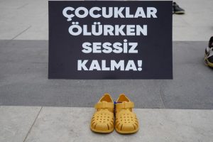 İsrail’in Filistin’e yönelik katliamları sürerken Kocaeli’de Gazze’de öldürülen çocuklar için sessiz ayakkabı nöbeti gerçekleştirildi. Çocuk ve kadın ayakkabıları bırakılan yerde bir kız çocuğu da Filistin özgürlük dansı ederek şarkısını söyledi.