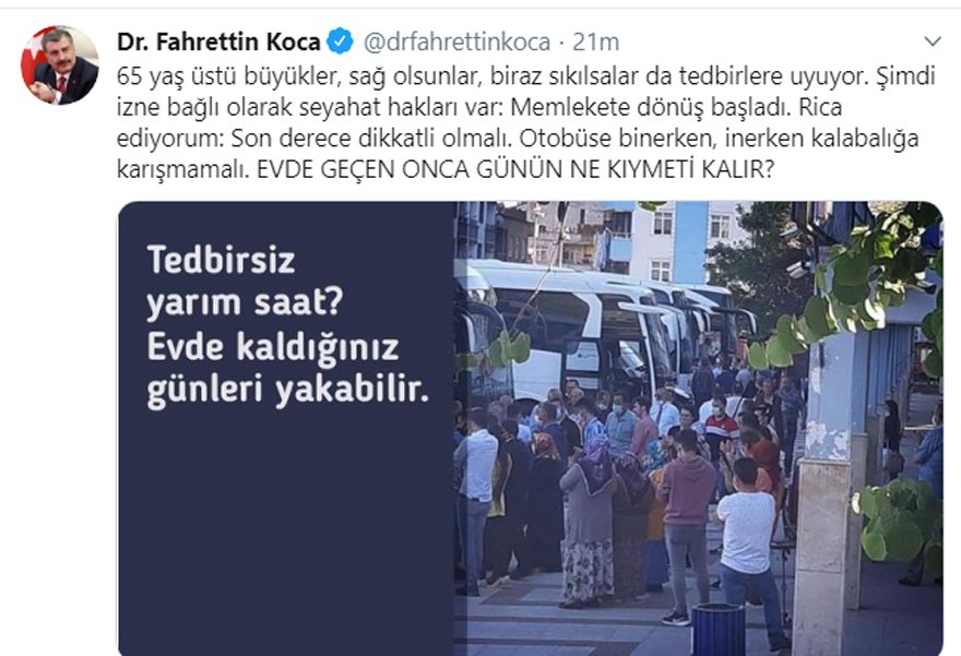 65 yaş ve üstü vatandaşlarla ilgili sokağa çıkma yasağı kararına değinen Koca, şu ifadeleri kullandı;