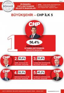 İzmir’in CHP’li Belediye Başkanı Tunç Soyer ise yüzde 55.6 ile üçüncü sırada yer aldı. Dördüncü sırada da Kocaeli Büyükşehir Belediye Başkanı Tahir Büyükakın oldu.