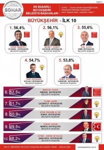SONAR 1 Kasım-27 Aralık tarihinde vatandaşlara, “Yaşadığınız büyükşehirde belediye başkanı başarılı mı?” sorusunu yöneltti. 20 büyükşehrin 7 tanesinde yüz yüze kalan 13 belediyede ise telefon aracılığıyla gerçekleştirilen anket çalışmasında en başarılı büyükşehir belediye başkanları belirlendi.