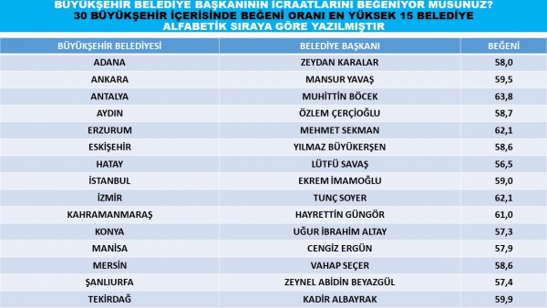 İstanbul Büyükşehir Belediye Başkanı Ekrem İmamoğlu’na oy veririm diyenlerin oranı yüzde 57, Ankara Büyükşehir Belediye Başkanı Mansur Yavaş’a oy veririm diyenlerin oranı yüzde 58 ve İzmir Büyükşehir Belediye Başkanı Tunç Soyer’e oy veririm diyenlerin oranı yüzde 62.8 olarak gözüktü.