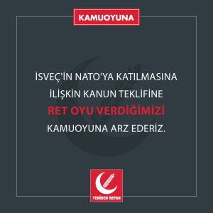 TBMM Genel Kurulu’nda İsveç’in NATO üyeliğinin onaylanmasının ardından Yeniden Refah Partisi’nden kamuoyuna flaş duyuru geldi. İsveç’in NATO üyeliğini reddettiklerini duyurdu.