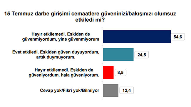 Araştırmaya göre “15 Temmuz darbe girişimi cemaatlere güveniniz/bakışınızı olumsuz etkiledimi?” sorusuna “Hayır etkilemedi, eskiden de güvenmiyordum, şimdi de güvenmiyorum” diyenlerin oranı yüzde 54,6, “Evet etkiledi, artık güven duymuyorum” diyenlerin oranı yüzde 24,5, “Hayır etkilemedi, hala güveniyorum” diyenlerin oranı ise yüzde 8,5 oldu.