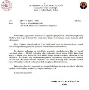 Yeni düzen 31 Mart 2022’den itibaren başlayacak. OGS etiketine sahip araç sahiplerinin bankalara giderek ücretsiz HGS etiketine sahip olacağını ve hesaplarının da buna dönüştürüleceği açıklandı.