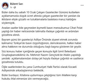 CHP Kocaeli İl Başkanı Bülent Sarı, AK Parti Milletvekili Radiye Sezer Katırcıoğlu’nun kız kardeşi Esra Yargıcı ve eşi Bülent Yargıcı hakkında yaptığı haber sonrası gözaltına alınan Kocaeli Gazetesi muhabiri Cihat Polat’la ilgili sosyal medya hesabından paylaşım yaptı.