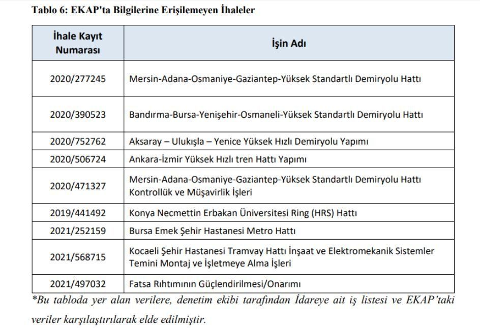 Ancak, yapılan incelemede, Bakanlık tarafından ihale edilerek sözleşmeleri imzalanan ihalelerin bir kısmının sonuç bildirimleri, Kanun’da öngörülen süreler dolduğu halde, EKAP T.C. Sayıştay Başkanlığı Ulaştırma ve Altyapı Bakanlığı 2021 Yılı Sayıştay Düzenlilik Denetim Raporu 46 aracılığıyla gönderilmediğinden söz konusu işlere ait ihale, ilan ve sözleşme bilgilerinin Platform üzerinden görüntülenemediği tespit edilmiştir.